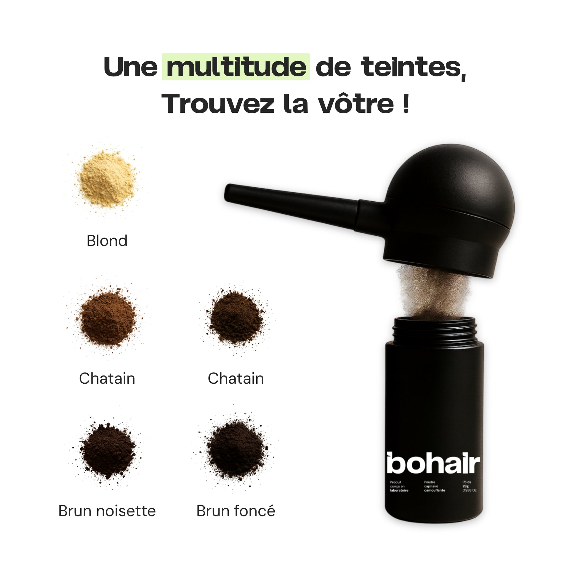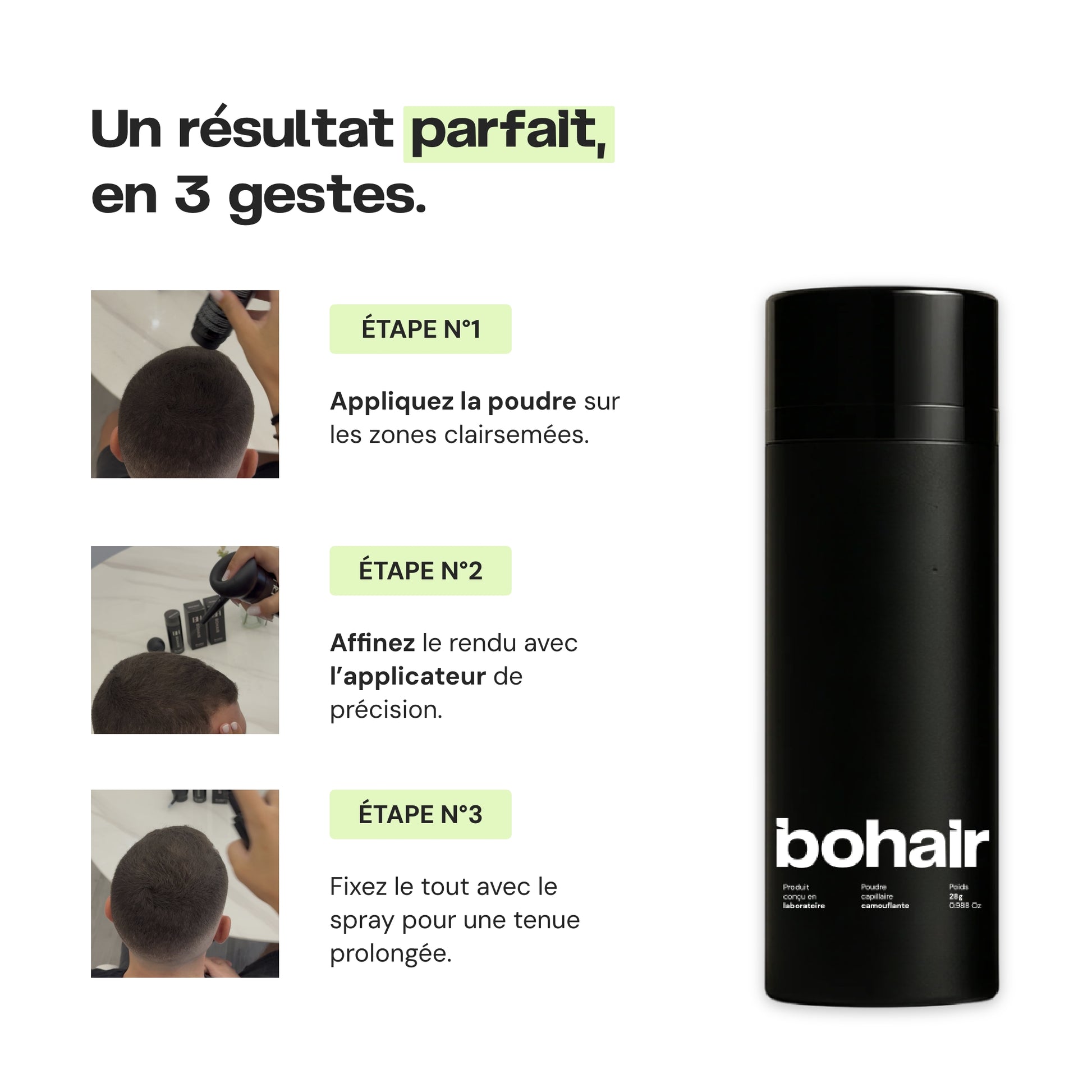 BOHAIR™ est une marque experte en solutions capillaires instantanées. Nos produits sont conçus pour masquer les zones clairsemées et redonner visuellement du volume aux cheveux, en quelques secondes.